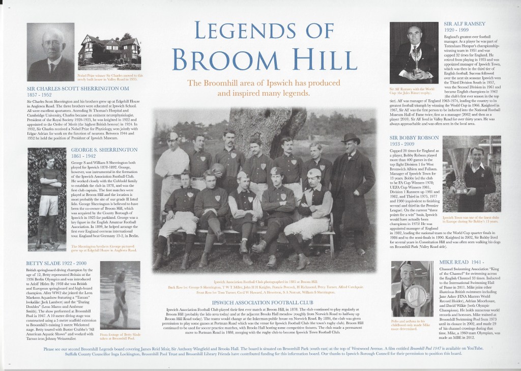 In 2016, the Broomhill Pool Trust (www.broomhillpooltrust.org) was proud to have commemorated the birthplace of Ipswich Town Association Football Club with a info-board showing the original team at Broomhill Park, Sherrington Road, adjacent Broomhill Pool’s entrance building.