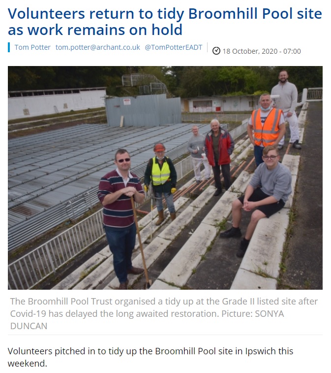 Ipswich Star reports – Volunteers return to tidy Broomhill Pool site as work remains on hold.